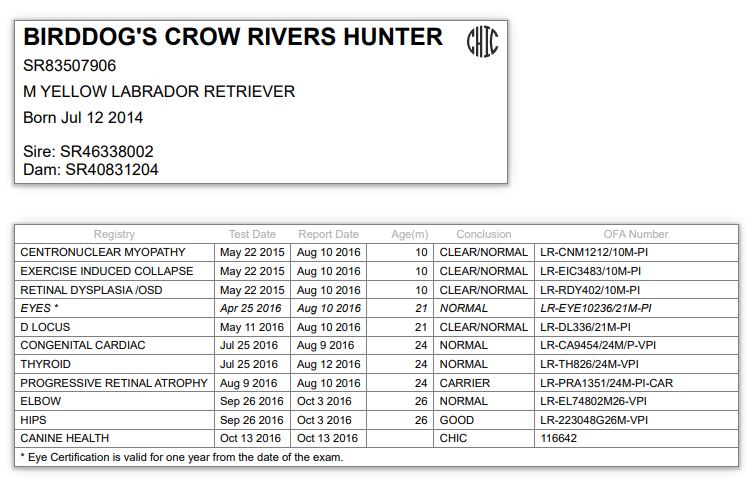 Hunter also tested Clear of all of the following genetic diseases: Cystinuria, HNPK, Hyperuricosuria, Narcolepsy, PKD, Degenerative Myelopathy, Skeletal Dysplasia 2 (SD2-dwarfism), Elliptocytosis, Myotubular myopathy 2 (MTM1), PRA-crd4 and GR-PRA2.