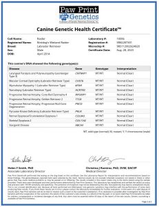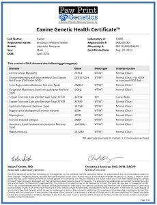 Also tested Clear of :Degenerative Myelopathy, Skeletal Dysplasia 2 (SD2-dwarfism), Elliptocytosis, Myotubular myopathy 2 (MTM1), PRA-crd4 and GR-PRA2