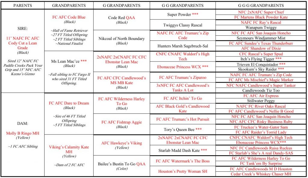 Raider’s pedigree is truly second to none! His sire is the 2011 National Amateur winner NAFC FC AFC Cody Cut a Lean Grade. Raider’s dam is Molly B Ringo MH (FC AFC Dare to Dream X MH daughter of AFC Hawkeye Viking).